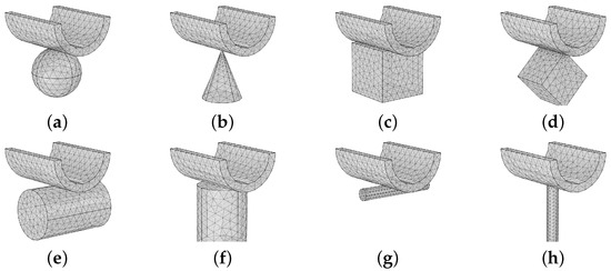 As shown in Figure 6, the types of stress defects include the simulation of eight contact situations between objects and pipelines. These contact conditions include: the mutual extrusion of the pipeline and spheres, the mutual extrusion of the pipeline and the cone, the mutual extrusion of the pipeline and cubes, the mutual extrusion between the pipeline and a coarse cylinder, and the mutual extrusion between a pipe and a fine cylinder. The displacement direction is the direction perpendicular to the surface of the pipeline’s wall that the object touches. It is possible to simulate the extrusion of the contact object on the wall of the pipelines. The randomly emulated squeeze is randomly generated for less than 1 cm.