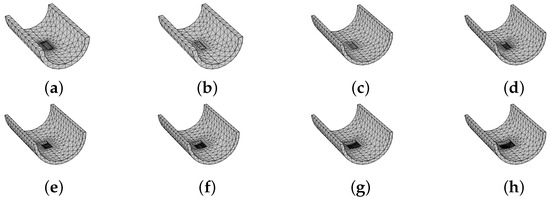 Examples of corrosion defects simulated by FE: (a) Depth 0.1 cm, length 10 cm, width 3 cm; (b) Depth 0.2 cm, length 10 cm, width 2 cm; (c) Depth 0.3 cm, length 10 cm, width 2 cm; (d) Depth 0.5 cm, length 10 cm, width 2 cm; (e) Depth 0.7 cm, length 10 cm, width 3 cm; (f) Depth 0.8 cm, length 10 cm, width 4 cm; (g) Depth 0.8 cm, length 10 cm, width 7 cm; (h) Depth 0.9 cm, length 10 cm, width 9 cm.