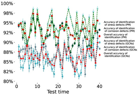 In Section 3, multi-graph splitting and fusion GCNs are proposed. Information splitting and information multiple fusion are used to illustrate the advantages of the structure of our proposed networks. We compare our proposed method with a typical GCNs method. For typical GCNs, the structural magnetic flux leakage signals are converted to unstructured data by an information fusion method with the defect type as the output. The dataset used for training and testing is the simulated dataset described by Section 5. Five five-fold crossover experiments have been completed. The average accuracy of each test is shown in Figure 10.