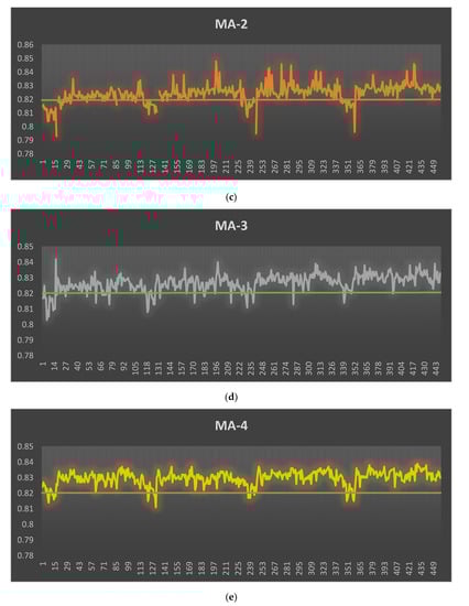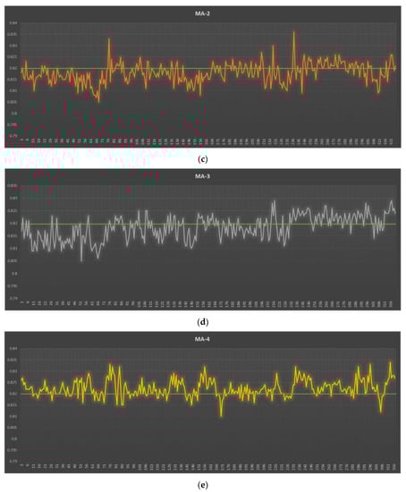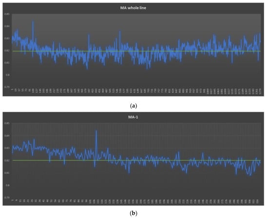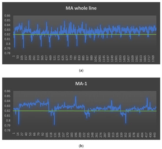 During the control phase, the process capability index for new data is measured. After applying Digital Poka-Yoke, project team members collect up-to-date samples to identify new process capabilities and monitor improvements. A total of 1282 samples were collected, and the production yield was 100%. As shown in Figure 10, the process average improved significantly and moved closer to the specification target. The process proven to have a higher capability to meet customer specifications. The results of the analysis showed that the process average of the MA line decreased from 0.827 to 0.820. In addition, the process variation is also significantly reduced, especially for the MA-3 line, from 0.007 to 0.004. Consequently, PCR-Cpk was enhanced for all MA lines (whole and 1–4 lines) and was greater than the recommended minimum value of 1.33 (see Table 4). This means improved processes to meet customer requirements.