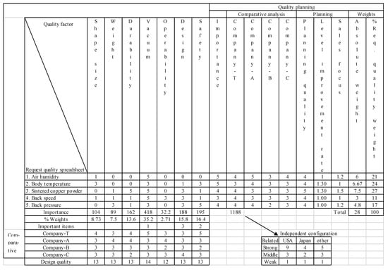 Step 2: Planning process—QFD is used to define and translate customer requirements into specific plans to produce a product that meets the voice of the customer. As shown in Figure 6, a summary of customer requirements is described in the house of quality matrix. Among the design factors, vacuum has the largest weight at 35.2%.