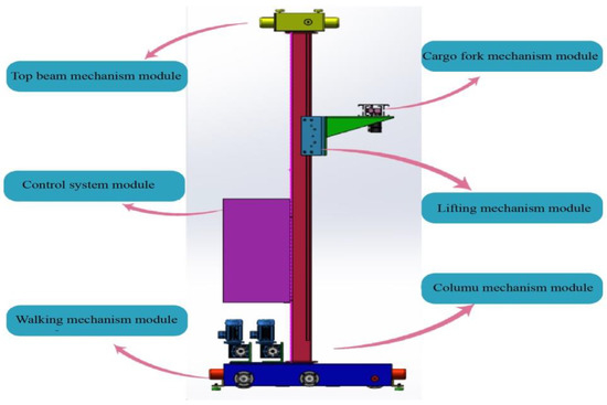 As the core equipment of intelligent logistics and automated three-dimensional warehouse, the stacker’s design directly affects the development trend of logistics industry and the production efficiency of enterprises [1,2,3]. The small rail roadway stacker is developing towards multi-type, high-speed and intelligent direction [4]. leading the progress in the field of logistics equipment. The parametric design is based on the algorithm thinking process. It expresses the structural characteristics or shape and size of the design object in the form of parameters, then links these parameters to establish the topological relationship between the design intention and the design response [5]. Compared with the traditional design method, the parametric design method undergoes great changes in both the way of thinking and the way of working. This can enrich the form of products, so as to meet the diversified and personalized requirements of the customers.