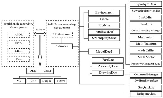 ANSYS mainly provides four secondary development tools: APDL (ANSYS Parametric Design Language), UPFs (User Programmable Features), UIDL (User Interface Design Language), Tcl (Tool command language). APDL is a parameterized design scripting language, which allows the users to organize operation commands in series without repeating input or output data between different software, thus performing the whole process of finite element analysis. The secondary development mode of ANSYS Workbench and SolidWorks and some required functional relations have hierarchical subordination, as shown in Figure 4.