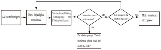 The program-driven model performs static interference checking mainly through the parts. The ToolsCheck Interference method in the API is used for identification. The operation trajectory of the automatic interference check is coherent with the trajectory of the manual operation mode. The interference check is mainly performed in the general assembly of the small rail roadway stacker. A top-level assembly is first performed. It is then crossed again, layer by layer, until the lowest assembly is found. Afterwards, an interference check is performed on it using IsNothing (vIntCompArray) and IsNothing (vIntFaceArry) commands, in order to determine whether an interference exists. The dynamic interference check requires to move the position of the model according to the working process. In addition, a static interference check is performed on the position of each stage after moving, and it cannot destroy the assembly relationship of the parts. The model of small rail roadway stacker mainly requires a dynamic interference inspection of the structures which should be displaced in the work engineering, such as the assembly of the module of fork mechanism and the total assembly, for example. The specific process is shown in Figure 5.