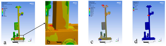 The load and constraints are presented in Figure 6a. The equivalent stress cloud map, drawings of partial enlargement, phase change cloud map and stress safety factor cloud map are obtained by solving the loaded small rail roadway stacker model, as shown in Figure 6.