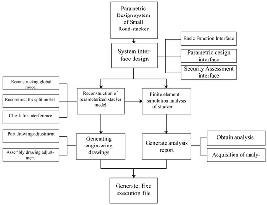The stacker design software system is prepared according to the steps shown in Figure 7. The system interface design mainly includes a basic function interface, parametric design interface and security evaluation interface. The reconstruction of the parameterized stacker model mainly includes the whole model reconstruction, split model reconstruction and interference check. Generating engineering drawing mainly includes the adjustment of parts drawing and assembly drawing. The finite element analysis of the stacker mainly includes the analysis of the stress, strain, safety factor and low cycle fatigue of the stacker under three working states. Generating the analysis report mainly includes the acquisition of analysis value and analysis image.