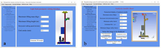 Enter the set parameters in the software for calculation, and the obtained results are displayed in the tree menu bar on the left. The engineering drawing interface is shown in Figure 8a. After the model is generated, the corresponding engineering drawing can be selected from the left tree menu bar. The analysis results are presented in Figure 8b. The latter can clearly express the analyzed data and picture information, and achieve the expected results. The maximum stress of this type of stacker is far less than the yield strength. In addition, the maximum total deformation is within the working accuracy range. The minimum safety factor is higher than China’s safety factor of lifting machinery (1.9). The estimated life expectancy is 7.1 years. The minimum fatigue safety factor is coherent with the structural safety value.