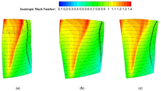 - An increase in solidity can significantly reduce the shock wave intensity and suppress the boundary layer separation induced by a shock wave. The radial migration of low-energy fluid under the actions of centrifugal force and radial pressure equilibrium after a shock wave can be significantly weakened, while the boundary layer separation loss during flow diffusion under the adverse pressure gradient may be increased. The low aspect ratio design can effectively decrease the boundary layer separation loss during flow diffusion. Therefore, reducing the number of blades and increasing the solidity at the same time can reduce the shock wave loss and the boundary layer separation loss, and the isentropic efficiency of the compressor rotor may be improved. However, the design of a large solidity and a small aspect ratio cannot improve the flow field near the hub region, and the absolute loss is positively correlated with chord length.