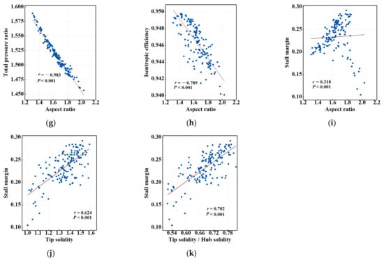 - There is a significant negative correlation between aspect ratio and total pressure ratio. To improve the total pressure ratio at the design mass flow point, the chord length represented by the aspect ratio is an important variable. There is a significant positive correlation between the ratio of the blade tip solidity to the hub solidity and the stall margin. To ensure that the transonic rotor has a sufficient stall margin, the ratio of the blade tip solidity to the hub solidity should not be less than 0.65.