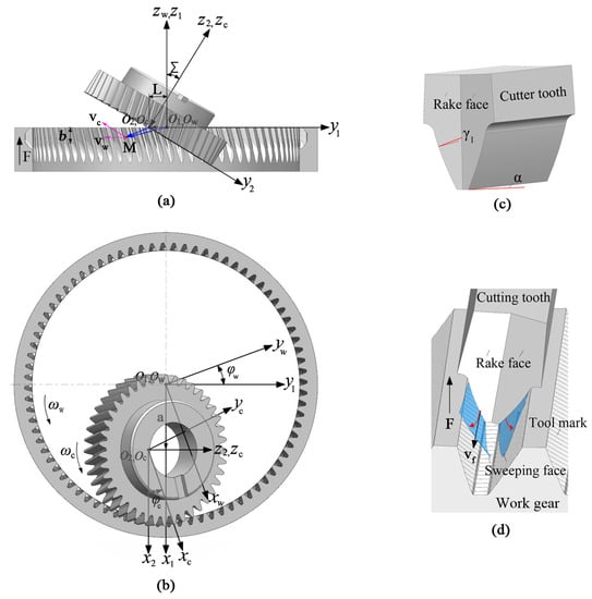 Several coordinate systems are introduced to describe the relative position and movement between the tool and the work gear. As shown in Figure 1a,b, the fixed coordinate systems of the work gear and the skiving tool are and , respectively. The tool setting parameters , , and are used to define the shaft angle, the center distance, and the offset distance between the work gear and the skiving tool. and are the attached coordinate systems of the work gear and the tool, respectively. A new type of skiving tool with double rake faces of each cutting tooth is proposed to improve the skiving accuracy of gears with profile and lead modifications, as shown in Figure 1c. The two side rake angles and the cutting edges of the cutting tooth can be designed separately to improve the cutting performance of the skiving tool. Moreover, the two flanks of the work gear teeth can be skived separately to meet different modification requirements of the two flanks of the work gear teeth.
