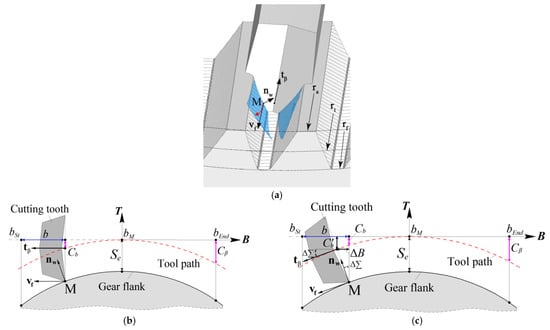 Generally, lead modification of gear skiving is achieved based on the conventional shaping, hobbing, or grinding by varying the center distance between the cutter and work gear successively in the cutting process. This may result in the twist of gear tooth flank of helical gear that can hardly be eliminated [,,]. Similarly, lead modification of the gear by skiving is achieved by changing the center distance between the tool and the work gear during cutting to obtain the desired inconsistent tooth thickness in the tooth width direction. Since the differential velocity can hardly be perpendicular to the normal vector of the modified gear tooth flank on the pitch cylinder developed surface, as shown in Figure 2b, the gear tooth flank can be easily twisted, especially when the work gear is helical and the helix angle is relatively large []. Figure 2b,c are plotted on the unfold plane of pitch cylinder as shown in Figure 2a, and the direction of “B” is parallel to as shown in Figure 1 while the direction of “T” is coincident with the tangent direction of the pitch circle on the point “M”.