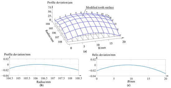 Based on the parameters of tooth profile and lead modification listed in Table 3, profile crowning and lead crowning can be added to the tooth flanks of the work gear by use of Equations (8) and (13). The tooth surface topographic of the work gear is shown in Figure 3a. Figure 3b shows profile deviation curves of the work gear at tooth widths of 10 mm. Figure 3c is the calculated helix deviation of the work gear at a radius of 106.5 mm. The crowning amounts of the crowned work gear surface are listed in Table 4.