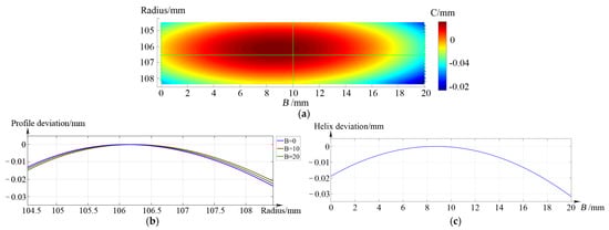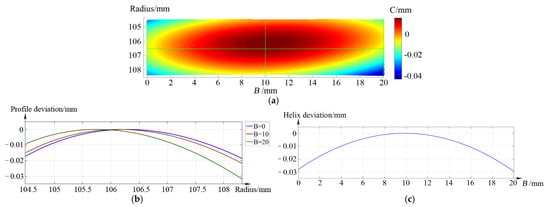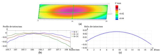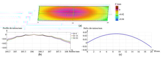 The deviation contour plot of the tooth flank enveloped via the general skiving method is shown in Figure 4a. This plot is obtained by comparing the enveloped gear tooth flank and the standard involute helicoid. It can be seen from the figure that the deviation of the side of the tooth surface is negative, which means the material of the tooth flank is removed at this part. Figure 4b shows profile deviation curves of the work gear at tooth widths of 0 mm, 10 mm, and 20 mm. Figure 4c is the calculated helix deviation of the work gear at a radius of 106.5 mm. According to the contour plot and the profile deviation plot, the shape and amplitude of the tooth profile deviation curves at different tooth widths are inconsistent. Moreover, the midpoint of tooth profile modification at a tooth width of 20 mm shifts to the addendum compared with the tooth profile at 0 mm, while the midpoint of modification at the tooth width of 0 mm shifts to dedendum, which means that a tooth flank twist appears.
