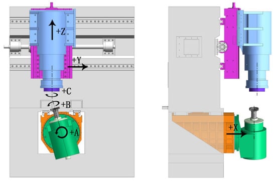 Presently, the proposed skiving method with alterable shaft angle cannot be realized on the existing gear skiving machine tools, because the swing axis A must be fixed in the skiving process, which is used to set the shaft angle , so machining simulation analyses are carried out using UG software which offers better performance in surface modeling. Based on the method shown in [], the feasibility of the proposed skiving method for gears with profile and lead modifications can be verified. The five-axis skiving machine tool model is built as shown in Figure 6. The center distance a can be set by moving the X axis. The offset distance can be set by moving the Y axis. The feeding of the work gear can be driven by the Z axis. The A axis is the swing axis that rotates about the X-axis, which can be used to set the shaft angle . The and the axes are the work gear rotation axis and the skiving tool rotation axis, respectively, which are coupled together by the electronic gearbox.