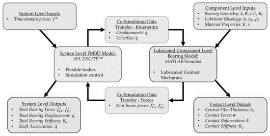 A co-simulation methodology combines a system level model of a flexible shaft and rigid housing, developed in AVL EXCITETM, with component level models of the lubricated bearings, developed in MATLAB and Simulink. Operating conditions such as rotational speed and external forces are defined in the system level model. Time step, iteration accuracy and simulation length are also defined. Material, geometric and rheological properties of the bearings are defined in the component level model. The kinematic conditions from the system level model (i.e., displacements and velocities in all active degrees of freedom) are passed to the component level model at each time step. For each individual rolling element, the non-linear force–deflection relationship is employed in conjunction with the EHL film calculations to compute the contact reaction force between the roller and race. The resultant force on the inner bearing race due to the contact forces and orbital positions of all elements is then returned to the system level model. The equations of motion are then solved, and the time step is advanced once numerical convergence is achieved. A flowchart of these models representing each time step of the simulation is shown in Figure 1.