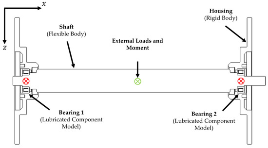 Partial mass displacements ) and velocities ) at the bearing locations are output from the dynamic model and used as boundary conditions within the lubricated component level bearing model at each time step of the simulation. This model returns resultant forces and torques on the inner race of each bearing () which are then used to solve the equation of motion (Equation (7)) within the dynamic model (see Figure 1).