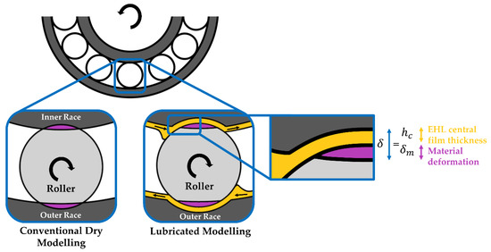 Modern electrified motors and transmissions operate at considerably higher speeds and lower loads than conventional powertrains [1]. This leads to much higher lubricant entrainment velocities at the roller–race conjunction of the bearings. Consequently, the elastohydrodynamic (EHL) film thickness can be of the same order of magnitude and often exceed that of the contact deformation predicted by dry Hertzian assumptions; hence, non-lubricated analyses are no longer valid.
