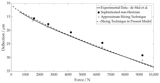 The application of the slicing technique was validated against the open literature. de Mul et al. [28] compared results obtained from an experimental rig with the numerical results calculated using both the approximate slicing technique and the sophisticated non-Hertzian technique [42]. By replicating the geometry of the test bearing used in their analysis, the application of Andreason’s slicing technique used for this analysis was validated with good agreement (see Figure 5). This method is a much faster way of calculating the contact load and moment than more sophisticated methods by de Mul, yet still maintains high accuracy.