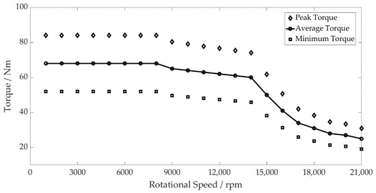 The motor has a peak torque of 68 Nm, and a maximum operating speed of 21,000 rpm. The torque transfer through the gear pair reduces as the speed increases due to the torque profile of the PMSM, as shown in Figure 6. The stator tooth forces from the PMSM are neglected in the model due to their minimal contribution to the lateral forces once resolved. For input to the model, the radial and normal forces are simplified by adopting sinusoidal inputs of the same magnitude and frequency of the gear pair at different speeds. The torque ripple from the motor is simplified using the same method.