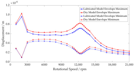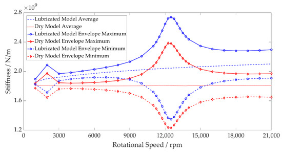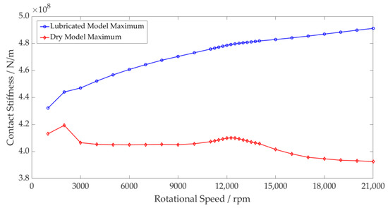 The contact level results (Figure 7) show a difference in the contact stiffness between the dry and lubricated models. The dry model follows the torque profile of the motor, with stiffness decreasing as the contact forces reduce. The period of resonance leads to the larger amplitude excitation of the shaft, resulting in an increase in the contact stiffness due to the force–deflection non-linearity. The lubricated model, however, shows an increase in the contact stiffness throughout the speed sweep. This is due to the higher levels of deformation at the contact as the lubricant is entrained, which increases with the shaft rotational velocity. This behaviour was experimentally observed by Dietl, concluding that the oil-wedge between the rolling elements and raceways reduces the internal clearance of the bearing and increases its stiffness [17]. The contact stiffness in the lubricated bearing model under the same operating conditions is therefore 24.9% greater at 21,000 rpm.