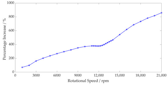 The peak contact force has been compared between both models. The percentage increase between the dry and lubricated models is shown in Figure 8. This more clearly shows the disparity between both models at the contact, with the largest difference being 9.6 times at maximum speed. During resonance, the inner race force reaches a peak of 1514 N, resulting in surface deformation magnitudes of 0.92 µm and 3.81 µm at the dry and lubricated conjunctions, respectively. As noted in previous works [15], higher loads lead to a greater surface deformation to the film thickness ratio, causing the percentage difference between the dry and lubricated models to reduce. Once the loads reduce as the speed increases, the percentage increase continues to rise.