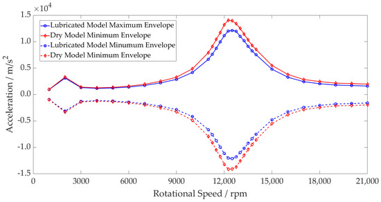 A quasi-dynamic speed sweep has been performed from 1000 to 21,000 rpm. The simulations are performed every 1000 rpm, refined to 250 rpm intervals throughout a period of system resonance between 12,000 rpm and 14,000 rpm. The operating envelopes are generated by plotting the maximum and minimum values from the steady-state signals at each speed interval. The conjunction level results are obtained from an individual roller and its contact with the inner raceway. The component and system level results are taken from the geometric centre of the inner bearing race, corresponding to the bearing seat on the shaft. The following figures represent results in the -direction, the largest component of excitation due to the tangential force from the gear meshing.