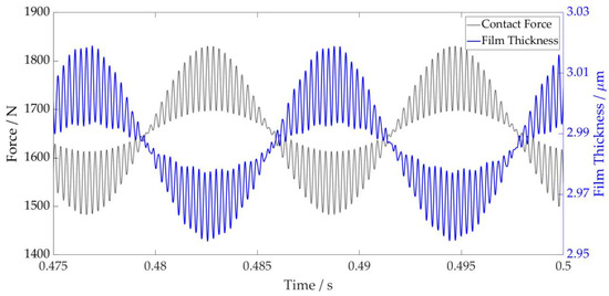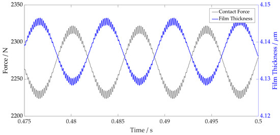 The lowest average film stiffness was N/m, which is over one order greater than the contacting material stiffness. The material therefore dominates the stiffness of the contact, and the stiffness of the EHL film can be neglected. The film is modelled as a rigid element that is present between the roller and race [31,32,33].