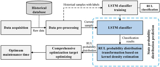 Taking advantage of LSTM network’s outstanding characteristics of system state tracking, this paper establishes a dynamic PdM policy. The recommended maintenance time was given through the prediction of RUL probability distribution, combined with the comprehensive optimization target. This policy is shown in Figure 1. The constructed LSTM classifier realized the classification of the current RUL. Then, according to the RUL classification results, the probability distribution of the RUL was converted based on a kernel density estimation method to form a continuous RUL probability distribution. The optimization objective considered several factors and constructed a comprehensive index as the optimization objective of the algorithm model. The specific content of each step is described below.
