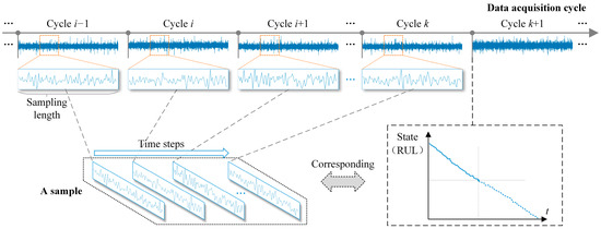 Sample extraction. According to the input data format requirements of the model, the raw data was organized into samples in a unified form. Each sample in this paper was a two-dimensional tensor, including two dimensions of the time step and the sampling length of each time step. That is, from a series of consecutive data acquisition cycles of a specific number, each intercepted data segments of a specific length to form a sample, which corresponded to the state (RUL) of the last data acquisition cycle, as shown in Figure 2.