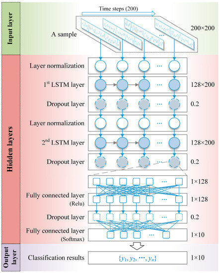 The structure of the constructed LSTM classifier is shown in Figure 3, which is divided into the input layer, the hidden layer, and the output layer. There were two LSTM layers in the hidden layer. Deep learning algorithms usually perform batch normalization during the data pre-processing step to improve the computing efficiency and the generalization ability of the overall model while the net input distribution of LSTM network neurons changes dynamically with time so the batch normalization method is not suitable. Therefore, layer normalization was utilized before each LSTM layer to effectively mitigate the situation of exploding or vanishing gradients and enhance the generalization ability of the model. After the two-layer LSTM network calculation, only the state output of the last time step was taken. Then, after two fully connected layers, the final classification calculation result was obtained, and the category corresponding to the largest item was used as the classification conclusion. The first fully connected layer used Relu as the activation function to keep the data dimension unchanged while the second fully connected layer used Softmax as the activation function to map the data dimension to the number of categories. To prevent over-fitting and improve the classifier effect, a dropout layer was set behind each LSTM layer and the previous fully connected layer.