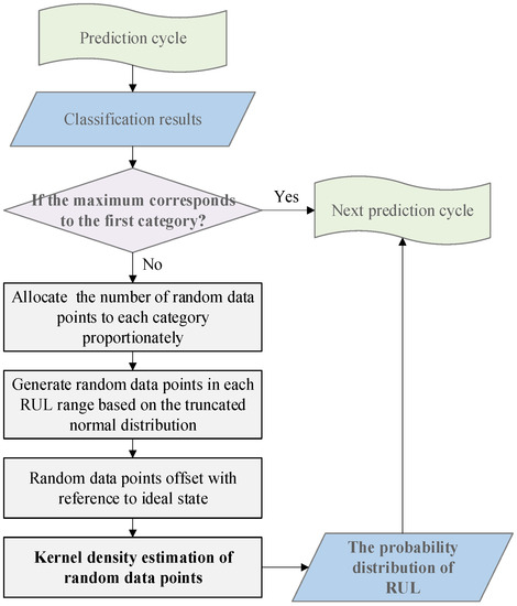 The LSTM classifier does not have many categories and should not have too many, so it is easy to belong to the same category for a long time, and the classification results will not change much. At the same time, in the critical phase, when two categories switch, the classification results will transform rapidly. To avoid these two situations causing the probability distribution prediction result of RUL to stagnate for a long time or fluctuate too fast, the offset of random data points needed to be set appropriately. For all categories, the ideal expectations were set with the upper limits of RUL windows as the initial value. In the whole maintenance cycle, each time a prediction was executed to obtain the RUL classification result, one prediction cycle duration was subtracted from the of the related category. The difference between the updated and expectation value was the offset value of the random data point.