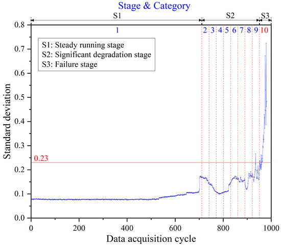 The data of the second experiment bearing 1 in the data set was selected for the training and verification of the classifier. The variation of the standard deviation of bearing vibration data is shown in Figure 5. It was assumed that the bearing was determined to be failed when the standard deviation reached a certain value and rose continuously. The entire process could be divided into three stages, the steady running stage, the significant degradation stage, and the failure stage. In the steady running stage, the bearing was in good condition, and there was no need to pay attention to its RUL distribution, so this stage was classified as category 1. In the significant degradation stage, the RUL of the bearing needed to be continuously concerned. For the subsequent RUL probability distribution transformation steps, the more RUL categories, the more accurate the distribution model will be. However, the number of categories should not be too large; otherwise, the accuracy of the classifier will be greatly affected. This paper divided the significant degradation stage into eight parts, which were classified as categories 2~9. The last failure stage was classified as category 10.