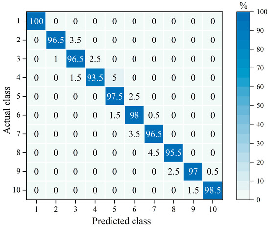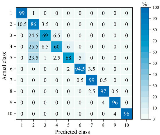 The accuracy of the classifier was evaluated using the probability confusion matrix [1]. The probability confusion matrix of the classification conclusion after importing the test set is shown in Figure 6. The overall accuracy rate of the test set classification was 96.95%. Except for the fourth category, where the accuracy rate was below 95% and it was relatively easy to predict RUL as the latter category incorrectly, the prediction accuracy of other categories was above 95%, especially in the last two categories around the bearing failure, the accuracy remained high, which was of great help to the PdM of the bearing. The case of classification prediction errors is mainly about predicting the RUL as a category adjacent to the actual category, and these errors should mainly occur at the junction between the ranges of different categories, which is a normal phenomenon.