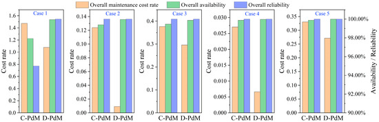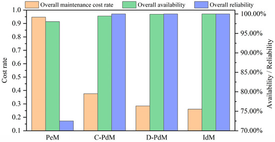 Among them, , , and were the weights of the normalized maintenance cost rate, availability, and reliability, respectively, which could be set and adjusted manually to realize the intervention in the PdM decision-making process. The closeness of the three normalization indicators to the optimal solution was: