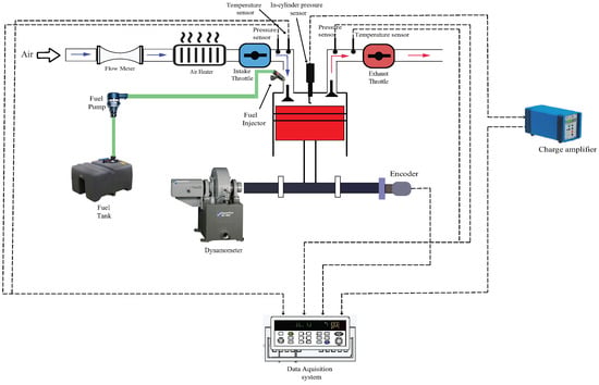 Figure 1 presents the schematic diagram of the experimental setup. The setup includes a 500 cc single-cylinder, 4-stroke, port-injected gasoline engine manufactured by the Taiwan-based company CEC. The engine specifications are provided in Table 1. An air heater (Leister LHS21L) is used to preheat the intake air entering the cylinder. K-type thermocouples are installed at the intake and exhaust manifolds to measure temperature. An intake manifold pressure sensor (SP–Ax102–B) is utilized to measure the pressure within the intake manifold.