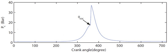 To measure in-cylinder pressure, an AVL spark plug sensor, ZI21U3CPRT, is used in conjunction with a charge amplifier (KISTLER 5011B). The volumetric flow rate of the intake air is recorded using a Schmidt flow sensor SS 30.301, with a measuring range of up to 229 N · 3/hour. The test engine is coupled to an FR 50 eddy current dynamometer with a torque rating of 150 N · and a power rating of 40 kW. An angle encoder (HENGSTLER incremental encoder RI38) is installed to measure the crank angle, with a maximum speed limit of 10,000 rpm. The engine is fueled with 92 AKI unleaded gasoline. Figure 2 illustrates the pressure curve within one cycle, along with the start of combustion timing.