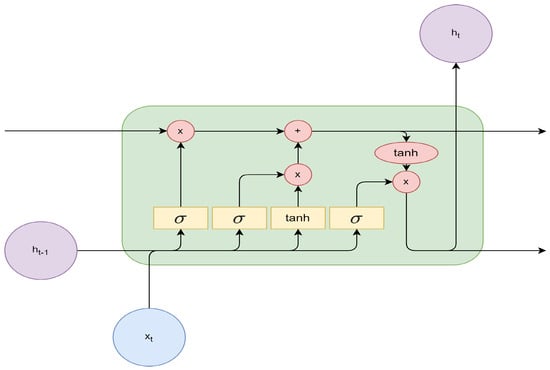 Figure 3 includes four interacting neural network layers, represented by yellow rectangles. They can be further classified into three sigmoid (abbreviated as in the figure) activation layers and one activation layer. The sigmoid gates output a value between 0 and 1, while the activation function outputs a value between −1 and 1. The gates are also known as the forget, input, and output gates [35]. Each gate has a unique function. The leftmost sigmoid layer is the forget gate, which determines how much of the previous state should be retained. The gate can be described with Equation (1).