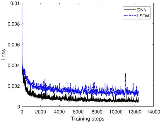 Training curve of LSTM and DNN during training with data 1 from Table 2. The loss curve of the LSTM is shown in blue; the loss curve of the DNN is shown in black. It can be observed, that the loss of each architecture converges after more than 4000 training steps.