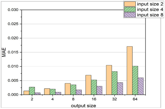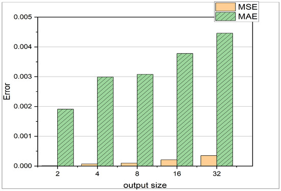 - Conversely, as the output size increases, the MAE and MSE values tend to increase. This outcome occurs because a larger output size corresponds to predictions that are further away from the current time step. For example, when the output size is 64, the LSTM predicts pressure states more than 64 time steps away from the input pressure states. Predicting these distant pressure states accurately becomes more challenging due to the cycle-to-cycle variation of cylinder pressure data.