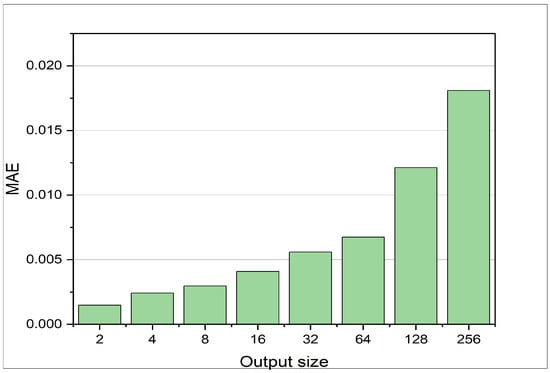 MAE at different output sizes for the LSTM. The LSTM is trained on data 2 stated in Table 2. The MAE shown is the error achieved on the test set for the defined test set. With increasing prediction horizon, the error increases.
