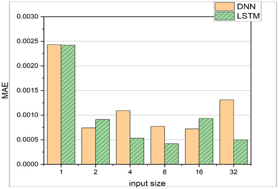 Comparison of DNN with 4 Layers and the LSTM with 1 Layer. Both networks are trained on the training data 1 from Table 2 and tested on the test data from data 1. The MAE with respect to different input sizes of vector can be observed.