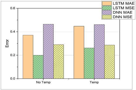In the present study, the LSTM-based model consists of one hidden layer with 32 neurons. The results can be seen in Table 5 and Figure 8, which depict the comparison between LSTM and DNN. The LSTM yields better results overall with just one hidden layer against the 4 hidden layers in the case of DNN, which results in saving memory and reduced training time. In the previous study, training was found to be optimal for 500 epochs, but in the present study, training for 10 epochs shows comparable results. This might be due to the fact that the size of an epoch can vary. The experiments show that the LSTM can perform better in the scenario of varying input sizes. Each experiment has a different number of input neurons, which can be defined as input size. For the LSTM, the MAE decreases with increasing window size except for the input size of 16. This demonstrates the LSTM’s ability to learn from time series data effectively. It can also be seen that the LSTM outperforms the DNN in 4 out of 6 cases, whereas the DNN only performs better for input sizes of 2 and 16. The DNN is not sensitive to an increasing window size. The test accuracy remains more or less constant between window sizes of 2 and 16. Only for a window size of 1, a much worse performance can be observed. The above comparison is based on the MAE and a constant temperature, whereas in the following experiments, the DNN and LSTM test results are presented at different intake temperatures. Table 6 provides MAE and MSE values for different datasets as defined in Table 2 for both DNN and LSTM architectures. Additionally, the experiments investigate how the two architectures, i.e., DNN and LSTM, cope with different temperature and crank angle as input features. The resulting MAE and MSE are presented in Table 7 and Figure 9. Regarding the computational time given the hardware introduced earlier in Section 3, the LSTM requires 2.73 s of computation during inference on the test set; the DNN requires 3.05 s. The training time of the LSTM is 7 min and 33 s; the training time of the DNN is 6 min and 16 s. Comparing the allocated memory for both architectures, the LSTM occupies 81 Kilobytes of memory space; the DNN occupies 181 Kilobytes. Therefore, it can be said, that the proposed LSTM architecture outperforms the DNN architecture both in inference time and in memory efficiency, even though the training time for the LSTM takes longer.