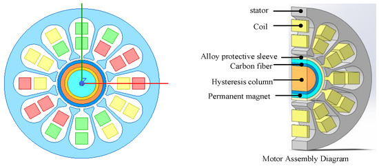 High-speed permanent magnet synchronous motor (PMSM) is one of the most important energy recovery or drive unit, which has attracted much attention because of its simple structure, high power density, no excitation loss and high efficiency [1,2,3,4]. PMSM is the key to develop high-end energy power equipment such as hydrogen fuel cell air compressor, flywheel energy storage and micro gas turbine. However, factors such as the rotor with no starting winding, the existence of permanent magnet braking torque, and foil-bearing preload cause starting difficulties for the motor [5,6]. In reference [7], a sensorless control strategy was used to control the drive of a permanent magnet synchronous motor (PMSM). A sensorless stator resistance tracking strategy based on switching PI control based on MRAS observer was proposed. Meanwhile, a double closed-loop FLC was designed to control speed and current to improve the response performance of speed regulation and the accuracy of command voltage. As the high-speed permanent magnet rotor has no salient pole structure, low-speed open-loop and high-speed closed-loop hybrid control methods are commonly used for motor starting [8]. However, low-speed open-loop control will produce large starting current and even current overload, causing permanent magnet demagnetization and motor damage. The existing methods of asynchronous starting [9,10] and closed-loop control starting [11] can only solve the starting problem for medium and low-speed motors due to the limitation of rotor structure. Due to the problem of starting current overload of high-speed rotors, the open-loop control mode of constant voltage frequency ratio (V/F) or constant current frequency ratio (I/F) is not adopted in the low-speed section [8]. Hysteresis ring can be added to the rotor to induce self-starting ability in low speed [12,13]. This kind of permanent magnet synchronous motor with hysteresis structures, that is, permanent magnet hysteresis motor (PMHM), has the advantages of both the high starting torque of the hysteresis motor and the high power factor of the permanent magnet synchronous motor. This structure avoids the complex rotor position detection and control technology in the low-speed section, enhances the reliability of the system, and reduces the cost and pulsating torque of the whole machine [14]. However, due to factors such as very low-force density and insufficient starting torque, the radial rotor structure is prone to slip. And the strength of the hysteresis ring is not high enough to limit the high-speed applications. Therefore, to ensure rotor strength, there is an urgent need to solve the problems associated with the rotors of high-speed PMHM slip due to insufficient starting torque.