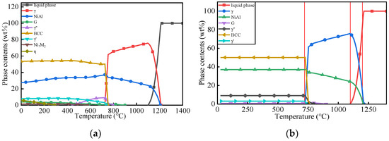 The relationship between alloy phase content and temperature: (a) before heat treatment; (b) after heat treatment.