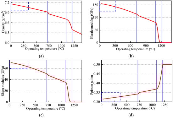 Relationship between mechanical properties and operating temperature for the improved AlNiCo material: (a) density; (b) elastic modulus; (c) shear modulus; (d) Poisson’s ratio.