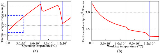 Thermal and electrical conductivities are two key parameters that have a direct impact on the temperature distribution for each part of the permanent magnet hysteresis column rotor. As shown in Figure 4a, the thermal conductivity of the material linearly increases before 730 °C, reaching 35 W/m·K at 300 °C, which is 3.4% higher than that at room temperature. The conductivity parabolically decreased before the formation of the liquid phase. The conductivity is 3.3 × 106 1/Ω·m at room temperature, and it decreases to 1.3 × 106 1/Ω·m with the increase in temperature. At 300 °C, the conductivity is 2.25 × 106 1/Ω·m, which is slightly smaller than the pre-designed value because the insulation coating on the surface of pure iron is not taken into account in the calculation of material properties.