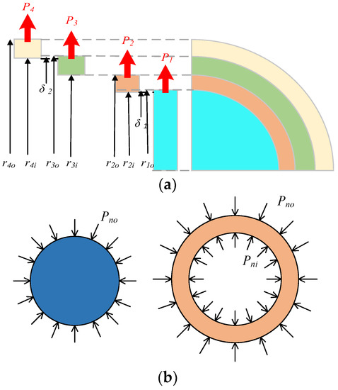 To obtain the static pre-stress for each part of the rotor, the stress needs to be solved using the following stress boundary conditions. The stress in the rotor structure is continuous, so it can be assumed that the contact stresses from inside to outside, as shown in Figure 5, are , , and , respectively. The relation formulas are , , and , respectively. Because the outer diameter of the rotor is not restricted, it meets the condition of , . The stress boundary conditions of the rotor structure can be written as follows.