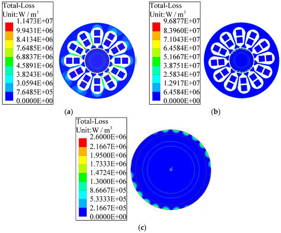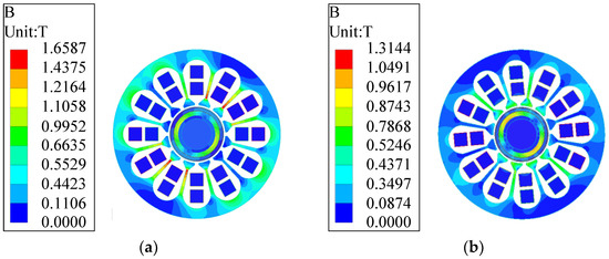 Taking the speed of 120,000 rad/min as an example, the interference fit for the composite rotor with = 0.01 mm and = 0.06 mm was selected, as shown in Figure 5. When it runs at 1.38 ms, the motor enters a stable operation state at the allowable temperature; the magnetic density distribution under no-load and load conditions are shown in Figure 6. Among them, the maximum magnetic density of 1.54 T occurs in the stator part at no-load; in the rotor part, the maximum magnetic density of 0.99 T occurs on the permanent magnet. The maximum magnetic density of 1.13 T in the rotor part also occurs on the permanent magnet under load. For a pair of pole motors, the magnetic density is symmetrically distributed. According to the B–H curve of the motor materials, the magnetic density of each part does not reach magnetic saturation when the motor is running, which meets the design requirements of the motor. The losses under the two conditions are shown in Figure 7a,b, respectively. The rotor losses are concentrated in the outer metal sleeve due to the skin effect.