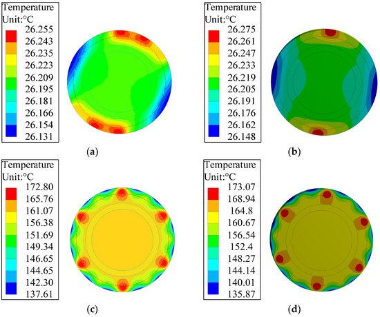 Temperature distribution of the rotor under different conditions: (a) no-load for electromagnetic field; (b) no-load for temperature field; (c) under load for electromagnetic field; (d) under load for temperature field.