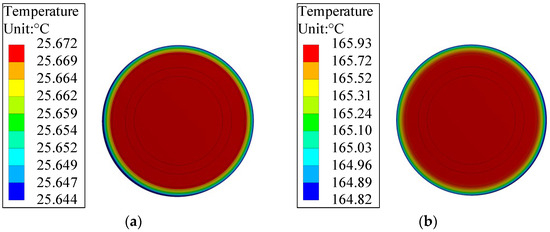 The bidirectional coupling of the electromagnetic field and the temperature field is solved, and their distribution under two working conditions is obtained, as shown in Figure 8. Due to the cooling of the outer surface of the rotor after being in contact with the air, change in the temperature gradient mainly occurs in the metal protective sleeve of the rotor, while the temperatures of the hysteresis column, carbon fiber, and permanent magnet are almost the same. The average temperature of the rotor under no-load is about 26 °C, while it reaches about 160 °C under load. Under the same working condition, the temperature gradient error, calculated using the electromagnetic field and the temperature field, is about 0.7%.